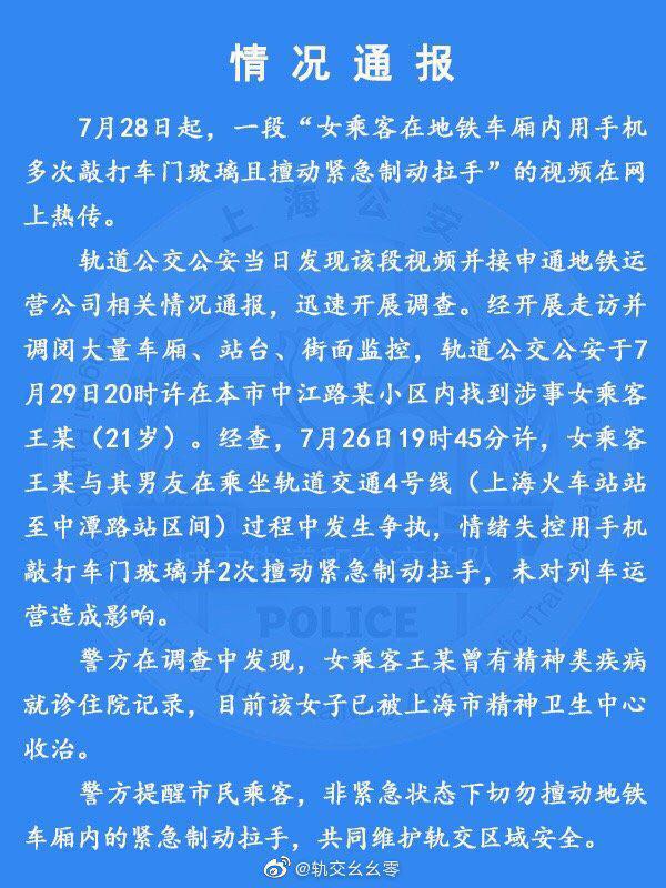 經查,7月26日19時45分許,女乘客王某與其男友在乘坐軌道交通4號線(上海火車站站至中潭路站區間)過程中發生爭執,情緒失控用手機敲打車門玻璃並2次擅動緊急制動拉手,未對列車運營造成影響。
