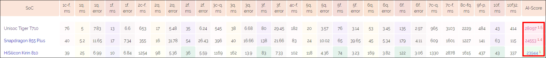 國外網站Slashleaks今年4月就曾公佈技術資料,顯示“虎賁T710”在AI浮點跑分上超過“驍龍855”、“麒麟970”等,位列第三。