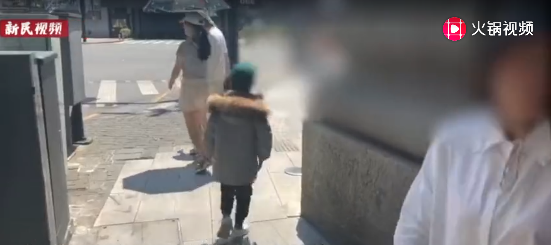 其中一個赤膊的小男孩引起了周圍人注意。“太陽這麼大,孩子光着膀子抱着鐵桿在避暑,而周圍四個大人正在整理冬季服裝。”原來,這個孩子正在大人陪伴下拍攝羽絨服廣告。