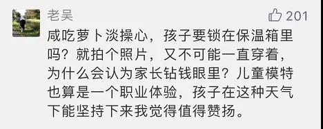 另有一方觀點認為,孩子不一定要“鎖”在保温箱裏。兒童模特也是一種職業,孩子在這種天氣下能堅持值得尊敬。