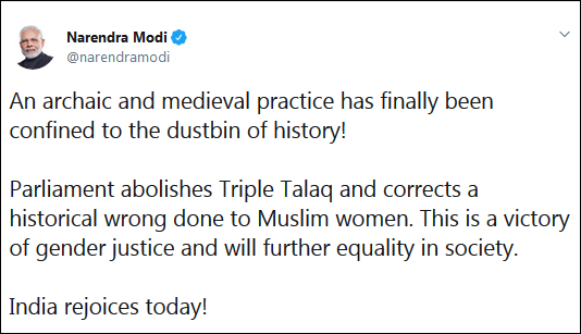 對於這項法案的通過,印度總理莫迪在推特上表示:“一種古老、中世紀習俗終於被扔進了歷史的垃圾箱,議會廢除了‘三喊塔拉克’的習俗,糾正了對穆斯林婦女犯下的歷史錯誤。這是性別公正的勝利,也將擴展社會平等。”