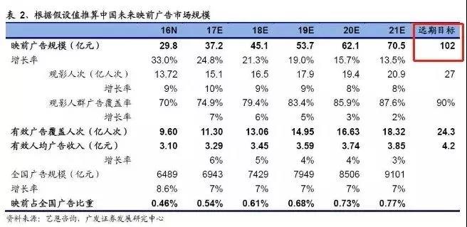 不可否認的是,內地電影市場並非一直高歌猛進,近年來我國影院和銀幕數日漸飽和,制約了映前廣告的發展。中金公司預計2018年映前廣告市場規模是44億元,近兩年行業增速約為10%,相較於2012年~2015年33%的年均複合增速,市場增速明顯放緩。