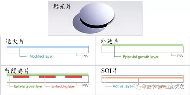 **硅片產品按照加工工序可分為拋光片、退火片、外延片、節隔離片和絕緣體上硅片五大類產品。**其中,拋光片是應用範圍最廣泛,用量最大、最基礎的產品,其他的硅片產品也都是在拋光片的基礎上二次加工產生的。