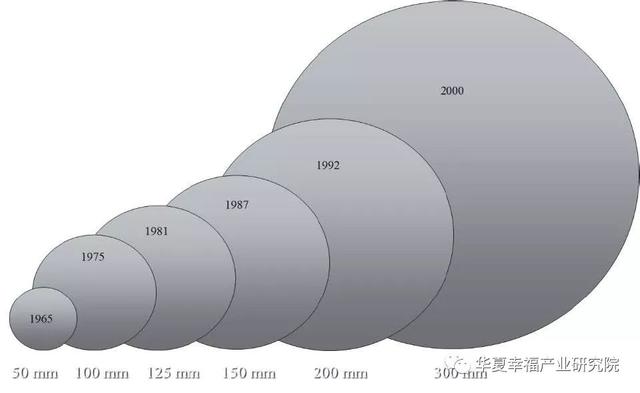 隨着提拉單晶技術的提高,硅片的尺寸隨着時間的發展逐步提升,從2寸(50mm),到4寸(100mm),5寸(125mm),6寸(150mm),8寸(200mm),到2000年的12寸(300mm)。12寸硅片的下一站是18寸(450mm)硅片,但由於設備研發難度較高,目前製造廠對於18寸的推動力不大,主流工藝以12寸和8寸硅片為主。