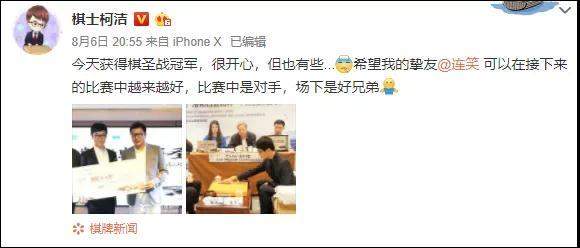 8月6日晚,柯潔還在微博“官宣”這一結果,他表示:獲得棋聖戰冠軍,很開心,希望摯友連笑可以在接下來的比賽中越來越好,比賽中是對手,場下是好兄弟。