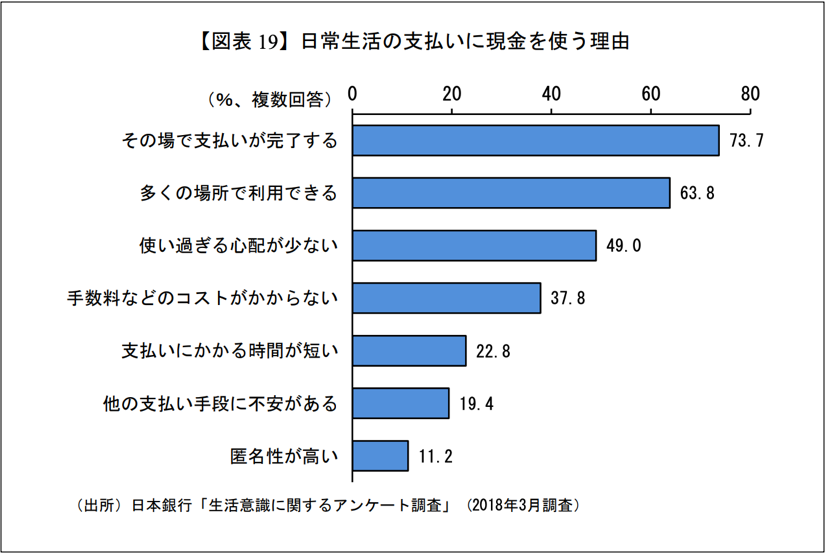 而接下來的分別是“現金在很多地方都能用”63.8%、“不會擔心用得太多”49%、“沒有手續費等額外支出”37.8、“支付不需要花很多時間”22.8%、“對其他支付手段懷有不安感”19.4%、“匿名性高”11.2%。