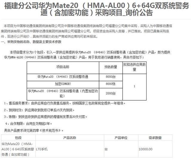 8月7日消息,中國移動通信集團終端有限公司及中國移動通信集團終端有限公司福建分公司集採華為Mate20 (HMA-AL00)6+64G雙系統警務通(含加密功能)。項目已具備採購條件,6日開始進行公開詢價。
