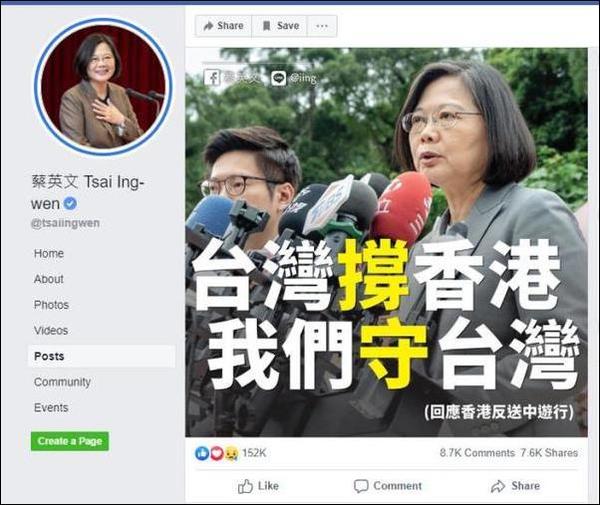 蔡英文6月10日在社交媒體説:“台灣支持香港人追求自由、民主與人權。自由就像空氣一樣,只會在窒息時,才會察覺它的存在。”