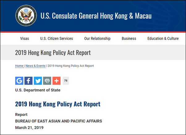3月21日,美國國務院發表《2019美國-香港政策行動報告》。