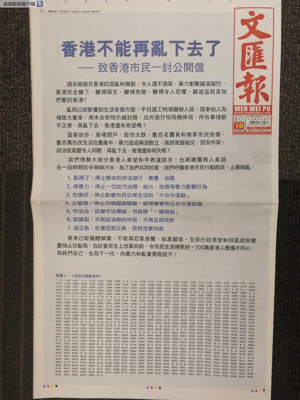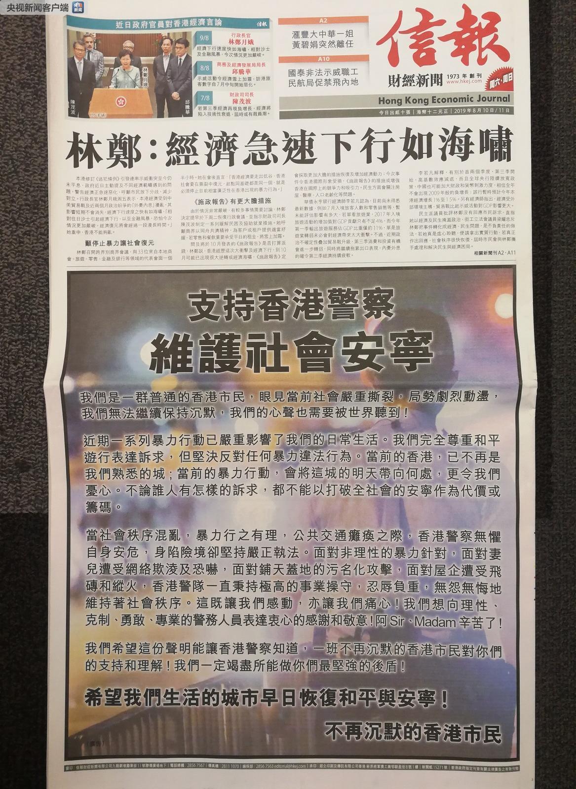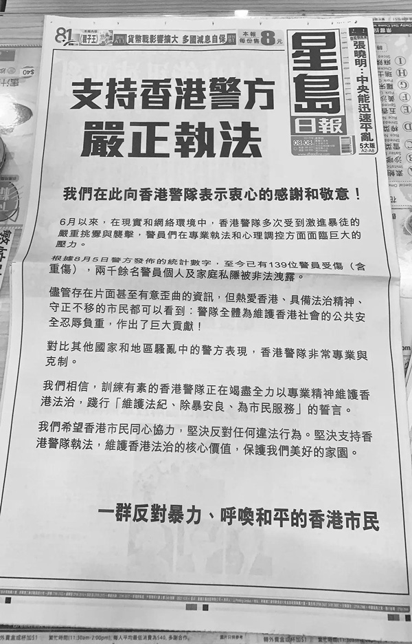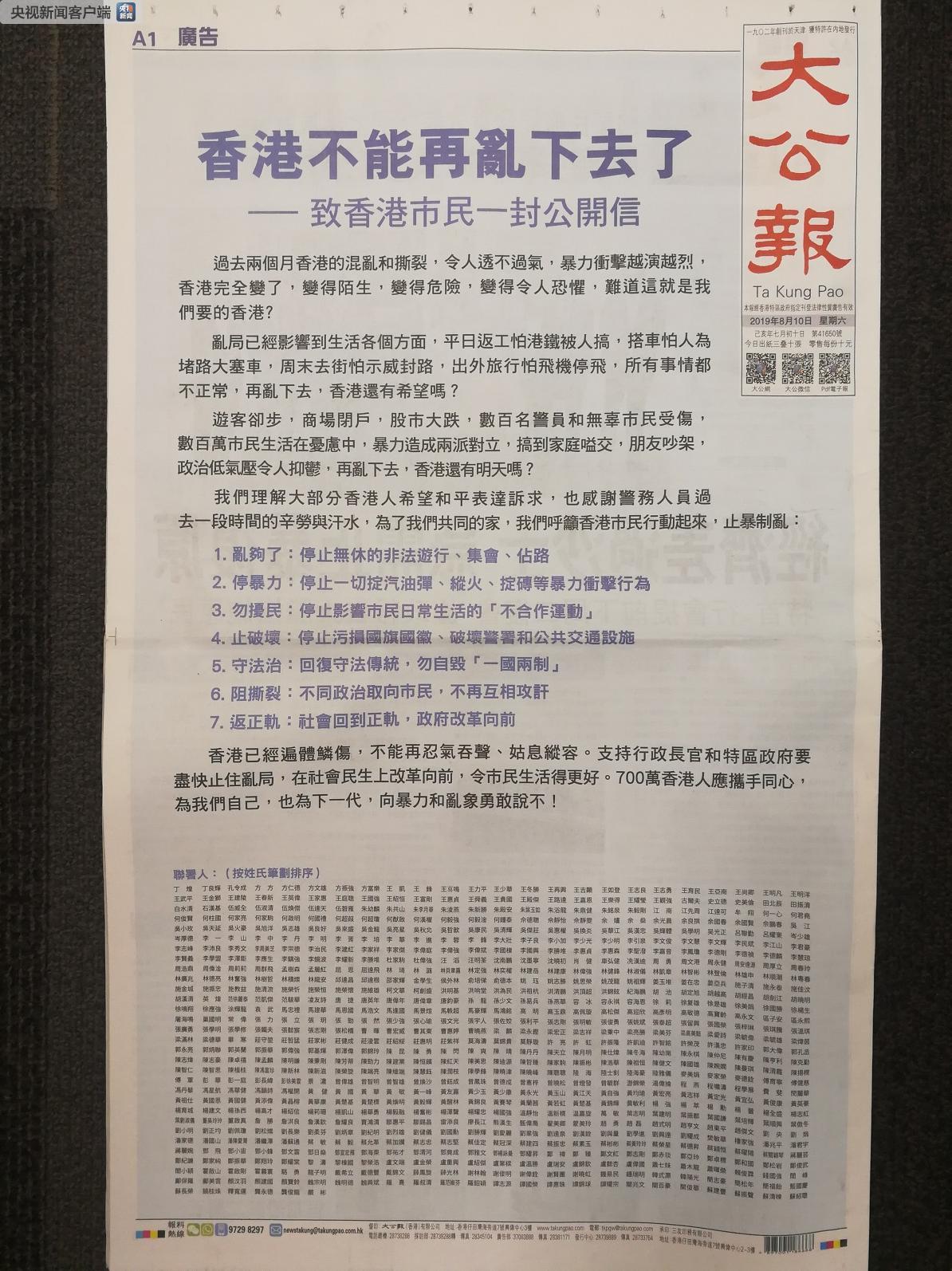 據央視新聞客户端消息,8月10日,香港《大公報》、《南華早報》、《文匯報》等多家媒體在頭版位置刊登了香港各界人士聯署的《香港不能再亂下去了》整版廣告,支持香港警察嚴格執法,維護社會安寧。文中指出,目前香港的亂局已經影響到生活的各個方面,遊客卻步,商場關閉,股市大跌。同時呼籲香港市民行動起來,止暴制亂,停止非法遊行、集會、佔路;停止暴力,停止影響市民日常生活的不合作運動;停止污損國旗國徽、破壞警署和公共交通設施;迴歸守法傳統,維護一國兩制;彌合社會撕裂,讓社會早日回到正軌。700萬香港人應該攜手同心,向暴力和亂象勇敢説不。