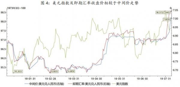 在美聯儲7月31日宣佈降息,以及8月1日宣佈9月1日起,對中國價值3000億美元的出口商品加徵10%關税後,8月5日,美國財政部官網宣佈中國為“匯率操縱國”2,也即在當天,人民幣匯率破“7”。美國財政部在官網宣佈的理解很簡單,他們聲稱“中國當局承認,我們對人民幣匯率有充分控制”。
