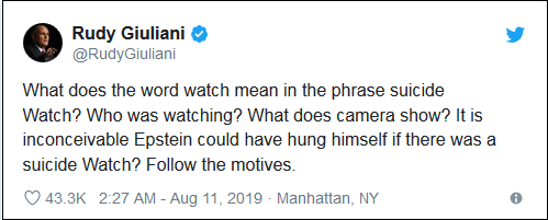 美國兩黨成員也認為,愛潑斯坦被移出觀察名單十分“荒謬”。特朗普的律師、共和黨人魯迪·朱利安尼11日表示,“他(愛潑斯坦)被撤銷了觀察名單,這太荒謬了”。同天,他還在推特上表示,在監視過程中,到底是誰在監視,攝像頭又顯示了什麼?