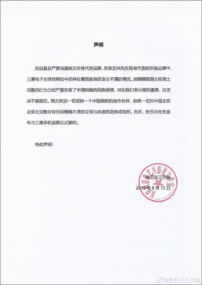 聲明稱,經自查及嚴肅溝通,在張藝興現有代言的所有品牌中,“三星電子全球官網迄今仍存在國家地區定義不清情況,其模糊我國主權領土完整的行為已經嚴重傷害了中國同胞的民族感情”。