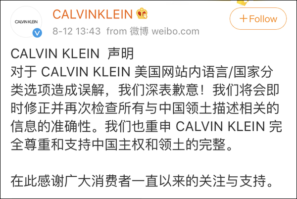 8月12日下午,@CALVINKLEIN 在微博發佈聲明稱,對於其美國網站內語言/國家分類選項造成誤解,深表歉意,將會立即修正並再次檢查。