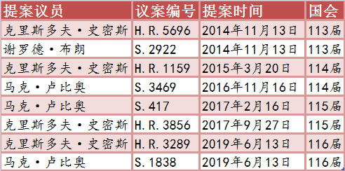 最近的一次是在2019年6月13日,盧比奧和史密斯兩人,同時在參眾兩院發起議案,內容一模一樣。