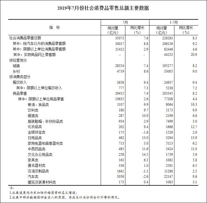 2019年7月份,社會消費品零售總額33073億元,同比名義增長7.6%(扣除價格因素實際增長5.7%,以下除特殊説明外均為名義增長)。其中,除汽車以外的消費品零售額30017億元,增長8.8%。