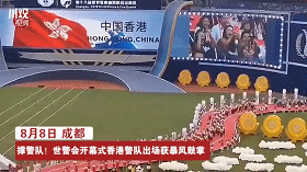 8日晚,在世警會開幕式上,當中國香港警隊入場時,現場大屏上出現了鮮紅的香港特別行政區區旗,飄揚的紫荊花和“中國香港”四個大字異常醒目。