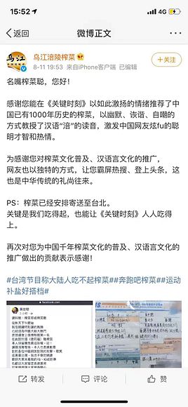 涪陵榨菜表示:“名嘴榨菜聰,您好!為感謝您對榨菜文化普及、漢語言文化的推廣,網友也以獨特的方式,讓您霸屏熱搜、登上頭條,這也是中華傳統的禮尚往來。PS:榨菜已經安排寄送至台北。關鍵是我們吃得起,也能讓《關鍵時刻》節目組人人吃得上。再次對您為中國千年榨菜文化的普及、漢語言文化的推廣做出的貢獻表示感謝!”
