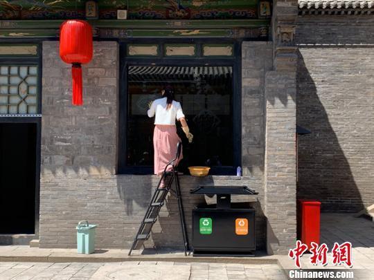 在景區內展示喬家大院文創產品的商鋪裏,工作人員正頂着太陽擦玻璃。