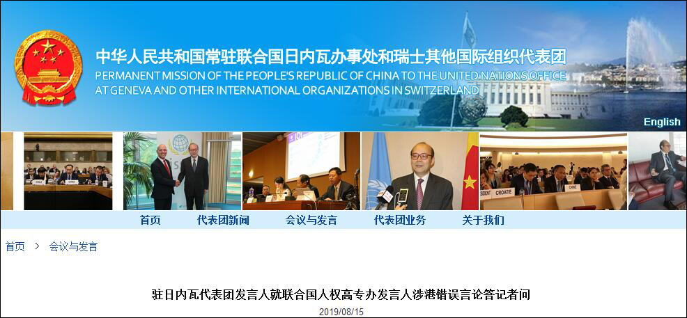 中國常駐聯合國日內瓦辦事處和瑞士其他國際組織代表團網站8月15日發佈《駐日內瓦代表團發言人就聯合國人權高專辦發言人涉港錯誤言論答記者問》,以下為答記者問全文: