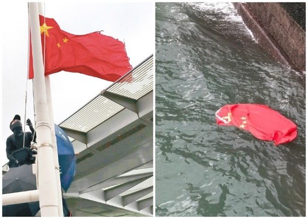 1名黑衣男子3日在眾人打傘掩護下扯下國旗並扔入海中 圖自:東網