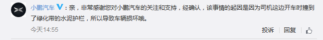 目前,交警部門和小鵬汽車官方仍未對這一事故的具體原因作出回覆。不過,小鵬官方微博曾在網友評論區回應稱,起因是由於司機開車時撞到了綠化帶水泥護欄,所以導致車輛損壞。