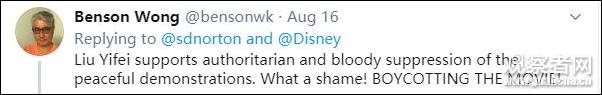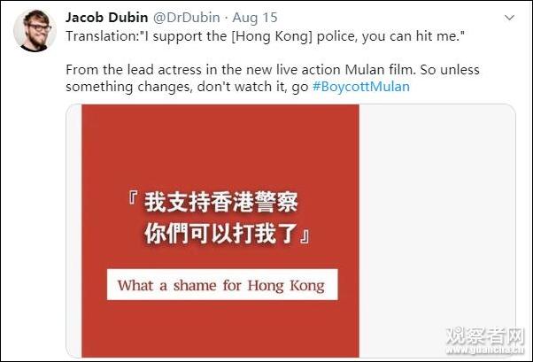 觀察者網注意到,在這些呼籲抵制的聲音中,下面這位網友的態度更甚,他一心認定劉亦菲是“警察暴力”和“鎮壓民主”的幫兇;