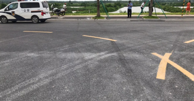 在確保被困人員安全後,交警開始勘查現場,對事故展開調查。沿着紅林路左轉車道看到,路面有兩條二三十米長的黑色剎車痕,一直由南往北延伸,來到T字路口後直直擦過路基,隨後消失不見。