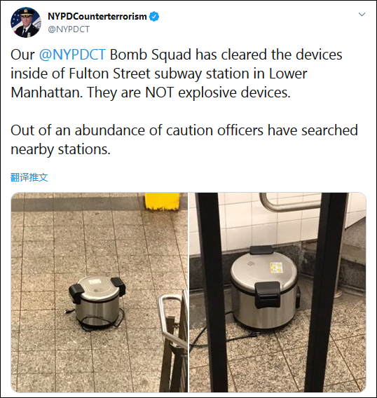 經過一天的追查,紐約警察局局長泰倫斯·莫納漢在推特上宣佈,在富爾頓地鐵站內放置“可疑物品”的男子已被拘捕,不過,他並沒有透露這名男子的身份。根據監控畫面顯示,這名男子在進地鐵時,手上抱着一個電飯鍋。