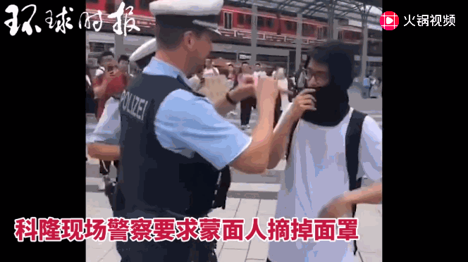 期間,一名用黑色面罩包裹頭部的亂港分子也出現在科隆的“愛國護港”集會現場。但兩名德國警察看到他蒙着臉後,當場要求其摘下面罩。