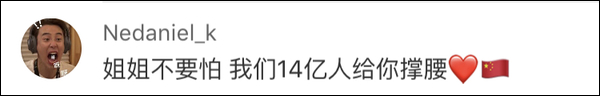 她寫道:“我是中國香港人,我是中國人。I’m from Hong Kong China. I’m Chinese. I love China. Hongkong is part of China forever……”