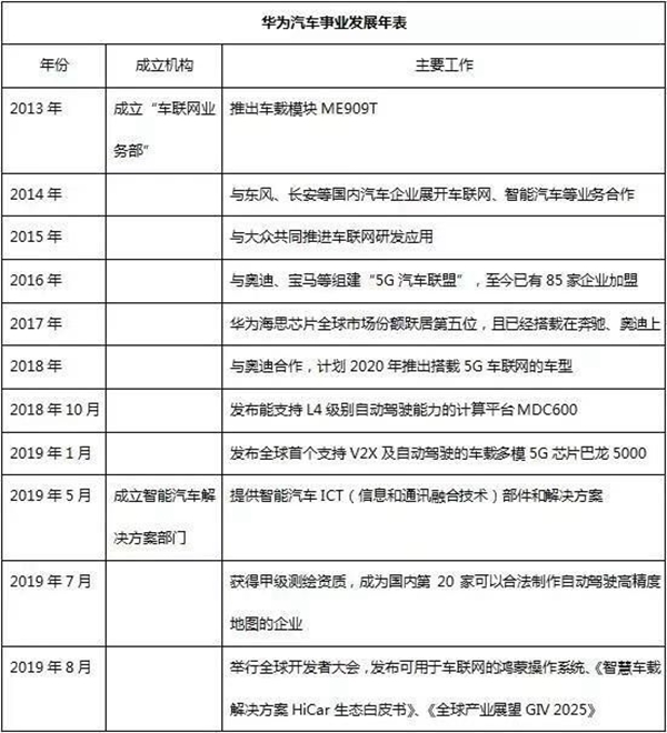 2019年5月底,華為正式成立了智能汽車解決方案部門,瞄準的是提供智能汽車ICT(信息和通訊融合技術)部件和解決方案,加大向智能網聯汽車、車載計算、自動駕駛等領域的戰略投入。