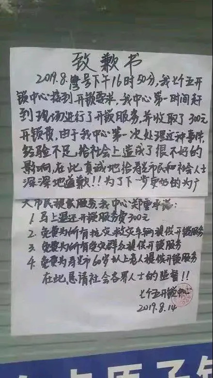 同一天,馬師傅公開致歉,稱事件系由於自己經驗不足所致,表示馬上退還300元開鎖費,並承諾將為救援車輛及受災羣眾免費開鎖。