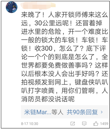 對於消防車進水,馬師傅收取300元開鎖費,網上出現截然不同的兩種觀點。有網民認為,馬師傅此舉是“賠了夫人又折兵”,以後開鎖中心要是出事情,不要找消防隊幫忙。