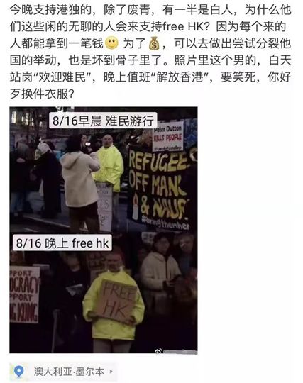 這不,同學們發現了一位在墨爾本的外籍“演員”。上午,他還在參加一個與難民問題相關的示威,晚上他連衣服都沒換,就舉起了“解放香港”的牌子。