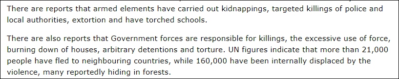 據新華網報道,2016年底以來,西南大區和西北大區持續出現示威,抗議中央政府,尋求改革和擴大自治。2017年下半年,一些激進的分離主義者宣佈英語區“獨立”、“建國”,發起武裝叛亂,大量民眾流離失所。為恢復秩序,大量的喀麥隆軍隊開進英語區,與分離主義武裝發生衝突。