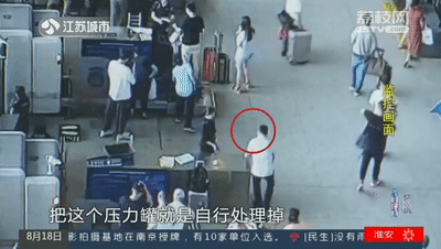 南京南站派出所民警張楠表示,該男子在過高鐵安檢時,安檢人員表示其攜帶的一個壓力罐為違禁物品,按照規定不可以帶上車,讓其自行處理。