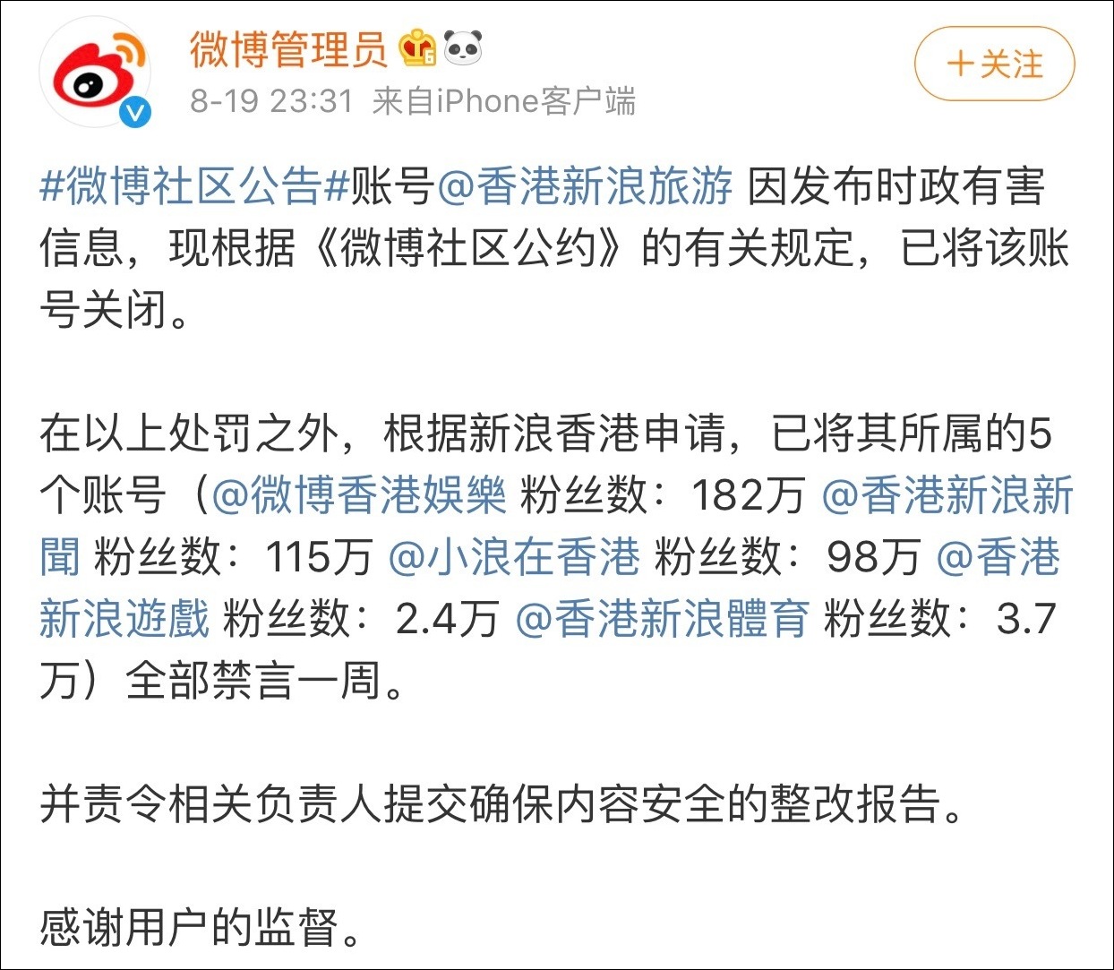 新浪微博社區8月19日發佈公告稱,賬號@香港新浪旅遊 因發佈時政有害信息,根據《微博社區公約》的有關規定,已將該賬號關閉。
