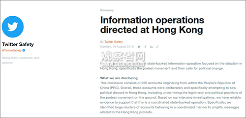 推特公司官方賬號“推特安全”在8月19日發佈了一份聲明,稱他們已經暫停了936個在內地建立的推特賬號。