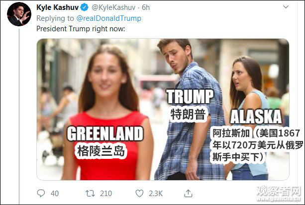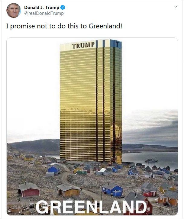 很快,19日晚上的時候,老爸特朗普也用了這張圖發了推特,但內容,卻和兒子完全相反。特朗普説:“我承諾,我絕不會對格陵蘭島幹這事兒。”