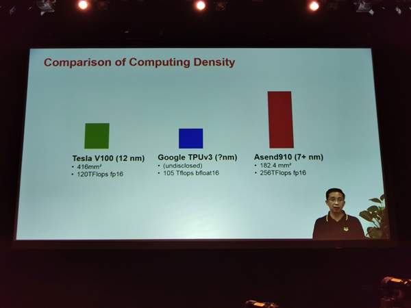 昇騰910 的運算密度超越了精品NVIDIA Tesla V100和谷歌TPU v3,華為還設計了擁有2048個節點的AI運算服務器,整體性能多達512 Peta Flops(2048 x 256)。