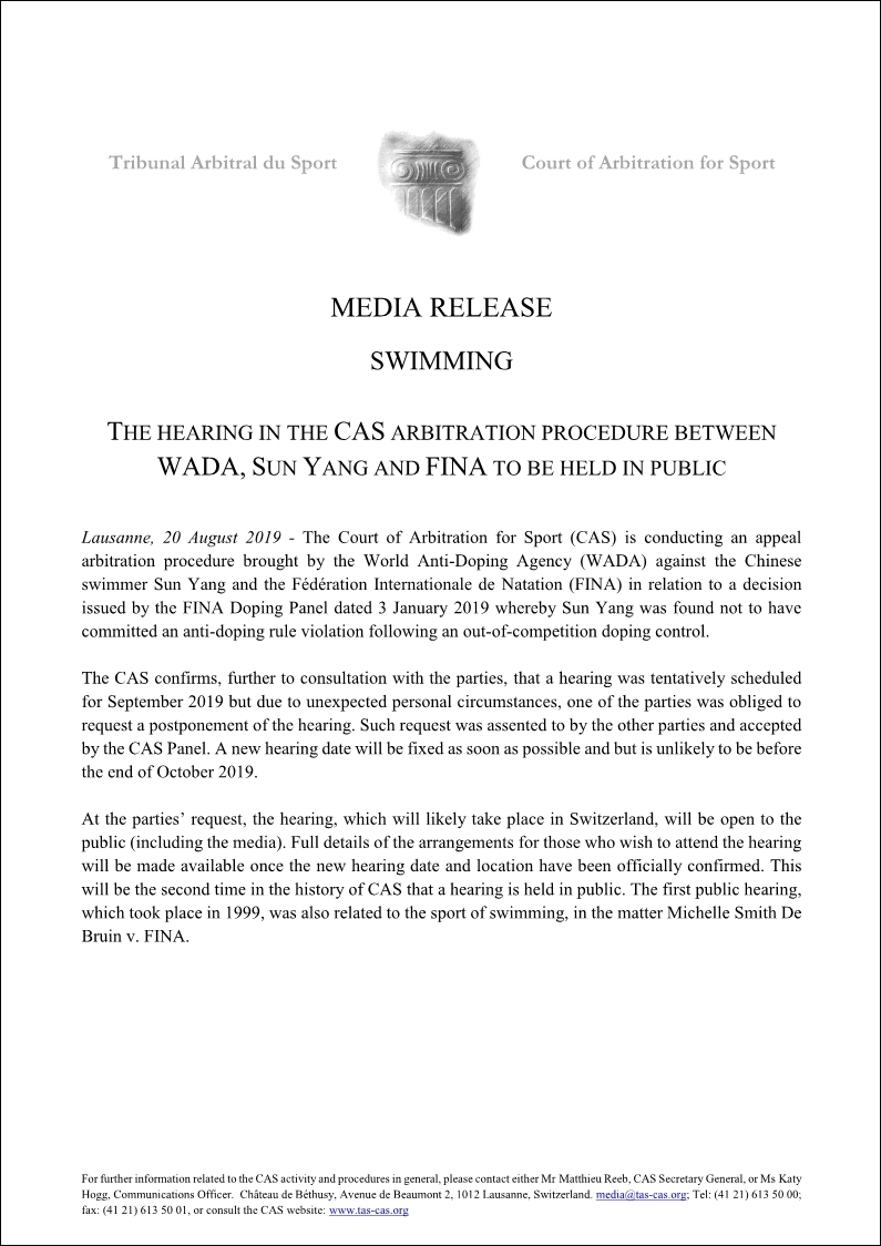 公告中稱,國際體育仲裁法庭已經接受了世界反興奮劑機構(WADA)對孫楊和國際泳聯(FINA)的上訴,但因其中一方“不可預見”的個人原因而不得不將原定於9月進行的聽證會延期。