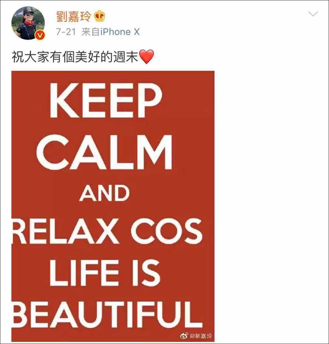 只是,在漫威影業宣佈由其出演“滿大人”這一角色的當天(7月21日),劉嘉玲在其微博發佈了一張“KEEP CALM AND RELAX COS LIFE IS BEAUTIFUL”(世界這麼美好,冷靜一點,放鬆一些吧)的圖,疑似回應此事。