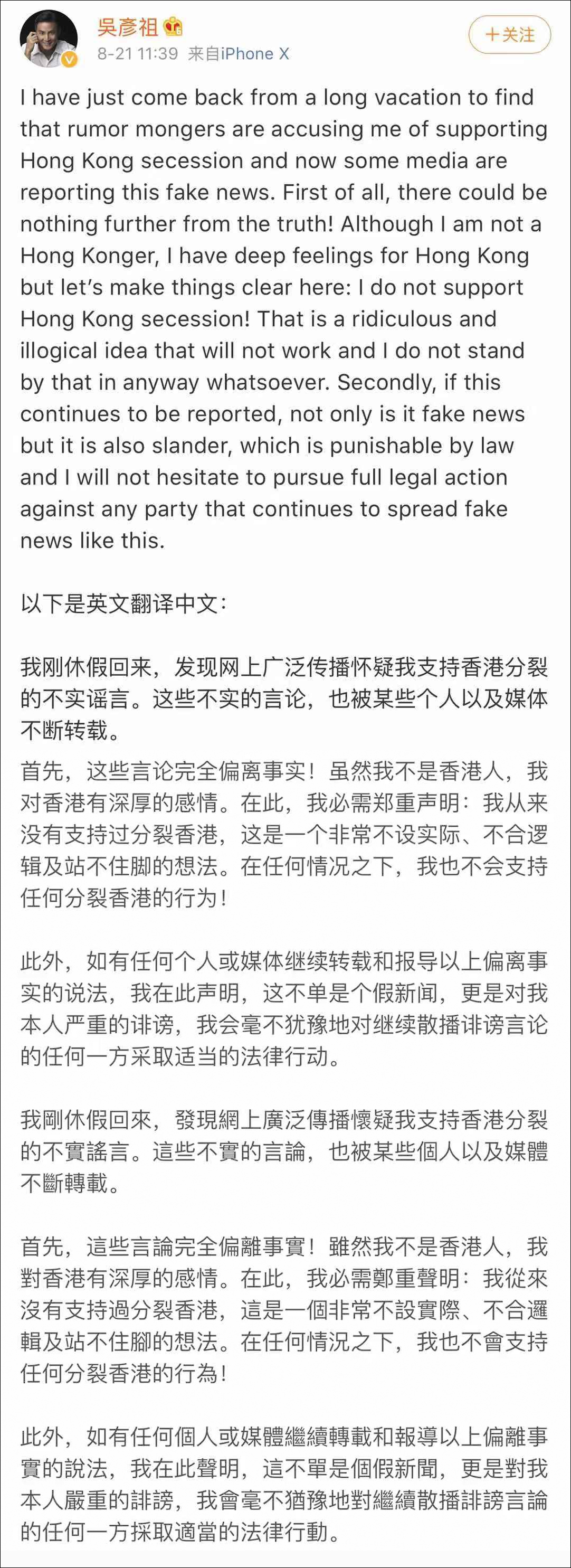 今天(21日)上午,吳彥祖在微博發文怒斥社交媒體上關於其“支持香港分裂”的説法。