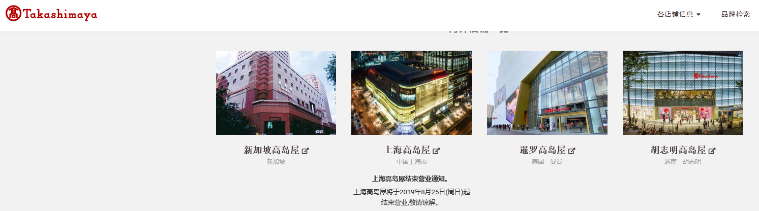 觀察者網此前報道,目前,全國範圍內僅有上海高島屋一家門店。6月24日,上海高島屋在其官網發佈了終止營業通知,稱上海高島屋將於2019年8月25日終止營業。