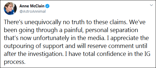 同時,NASA也發表聲明稱,麥克萊恩是一名頂級的宇航員,她在空間站中的表現非常出色,與其他員工一樣,NASA不會對他們的私人事務進行評論。目前,調查還在進行之中,兩人之間的離婚案則將於今年10月完成。