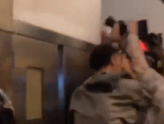 有“黑衣人”撿起鐵棍扔向警察 警察被記者包圍在樓梯間