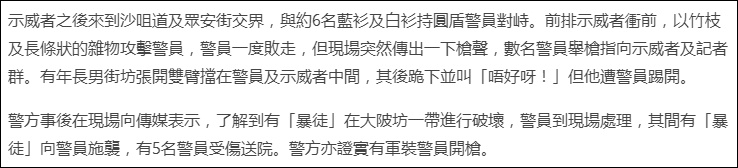 而在文字報道當中,對於警方遭受的“生命威脅”也都往往只是一筆帶過,令人完全想象不出當時場面之驚險,反而將重點放在各種可以“黑警”的小細節上。