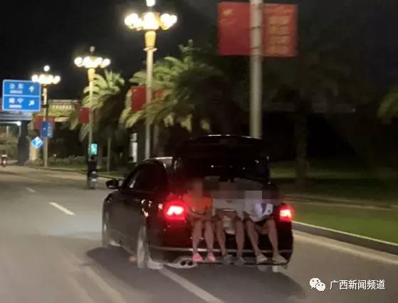 8月22日晚,有網友在防城港北部灣大道拍到一段視頻:一輛正在行駛的小車敞開後備箱,上面坐了三名年輕男女,他們把腳晃在車外旁若無人,讓人害怕!