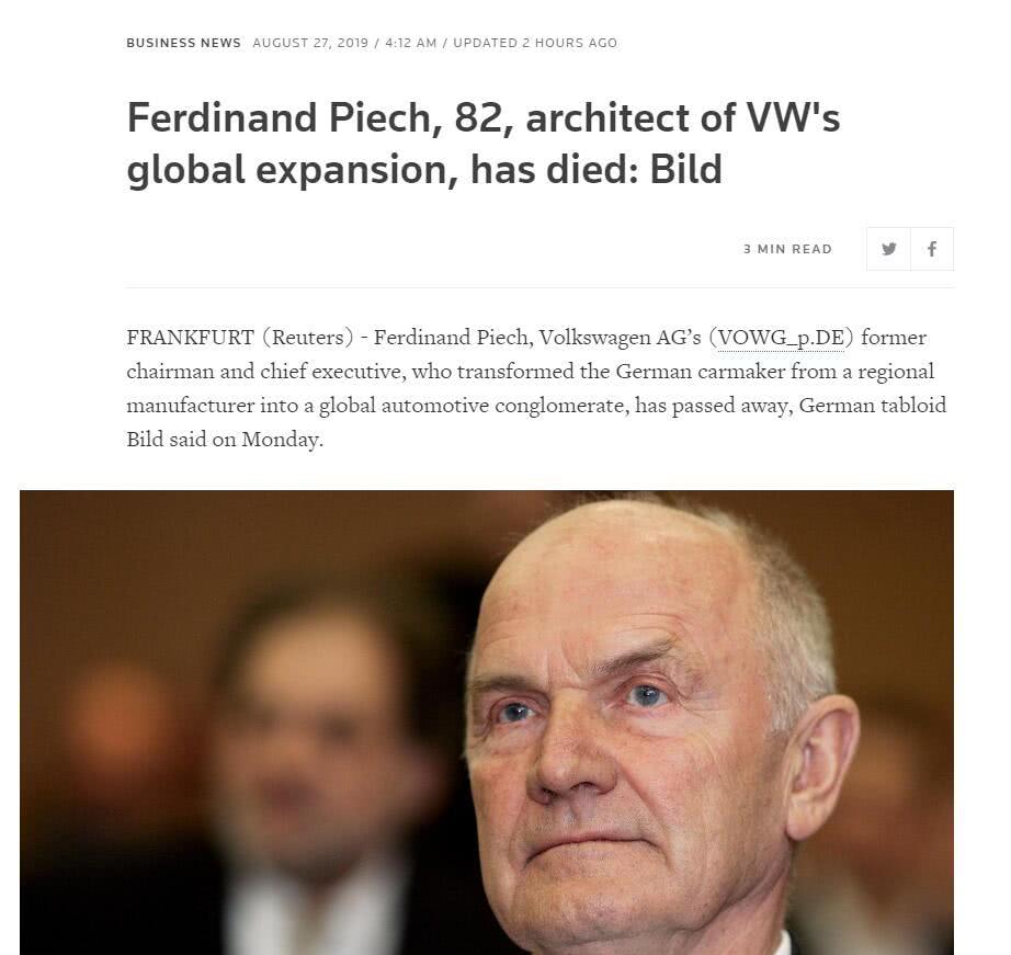 82歲的前大眾CEO皮耶希去世 曾一手打造大眾汽車“帝國”